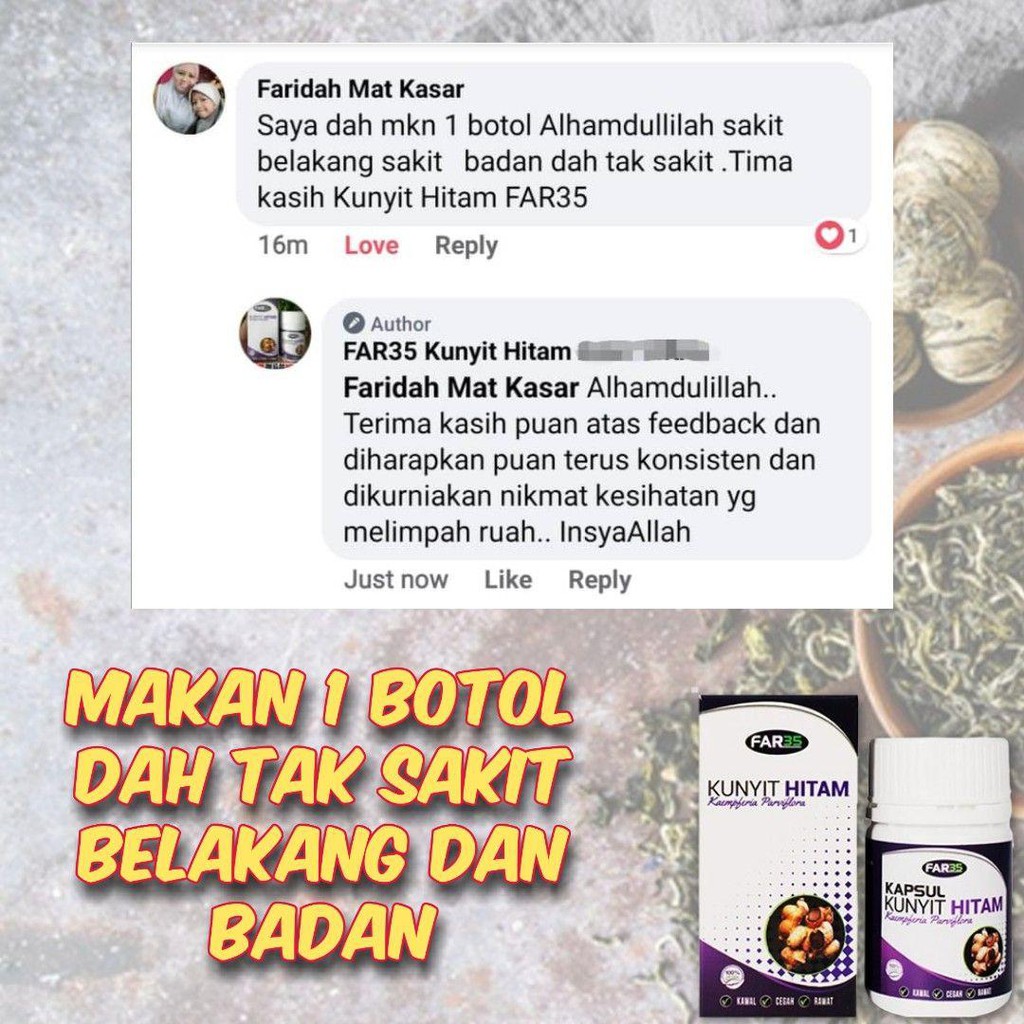 Pihak kkm masih dlm proses meluluskan kerana ianya produk baru dan hanya menggunakan bahan 100% kunyit hitam. Disebabkan permintaan yang agak tinggi, maka tidak hairanlah kunyit hitam diproses menjadi pil untuk dijual di pasaran. Formula hasil kajian mardi berasaskan 100% ekstrak kunyit hitam boleh membantu melancarkan kembali peredaran darah dalam badan. 12 manfaat utama kapsul kunyit hitam. Kunyit hitam merupakan tumbuhan herba yang sangat. Far35 kapsul kunyit hitam dirumus khas untuk membantu , kencing manis , darah tinggi ,resdung , cegah strok , gout , kebas kaki tangan , dan pelbagai . Website khas untuk abang akak yang ada masalah kolestrol tinggi, kencing manis, darah tinggi, gout dan kebas kaki tangan. 100 halal dengan pengesahan kkm. 563 likes · 2 talking about this. Ori hq far35 kunyit hitam (kaempferia parviflora.